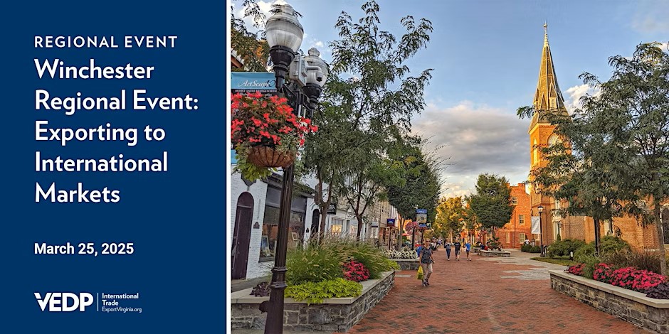Join VEDP - International Trade and Winchester-area companies on March 25 for an engaging panel discussion on exporting and global business development. Hear directly from small and medium-sized businesses as they share their export journeys and how they’ve successfully utilized VEDP’s resources to grow internationally. This event will also cover international income tax considerations and highlight VEDP’s research services, designed to support Virginia businesses navigating foreign markets.